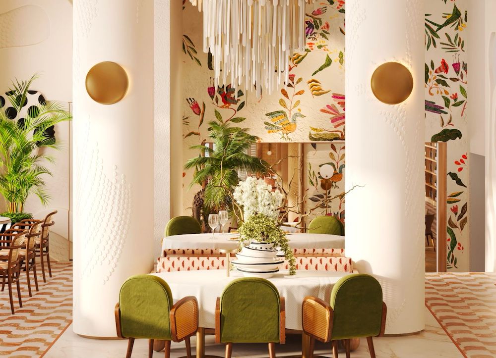 Step inside, and the first thing you notice isn’t the menu (though it promises delight), it’s the interiors. Walls are white, sculptured, and textured, creating depth and light without overwhelming the senses. Vibrantly upholstered plush dining chairs and sofas draped in rich fabrics invite you to settle in with the subtle insistence of someone who knows you might want to linger. Subtle design details create a room that feels both playful and sophisticated — a rare trick in Puerto Banús, where too many spaces try and too few succeed.